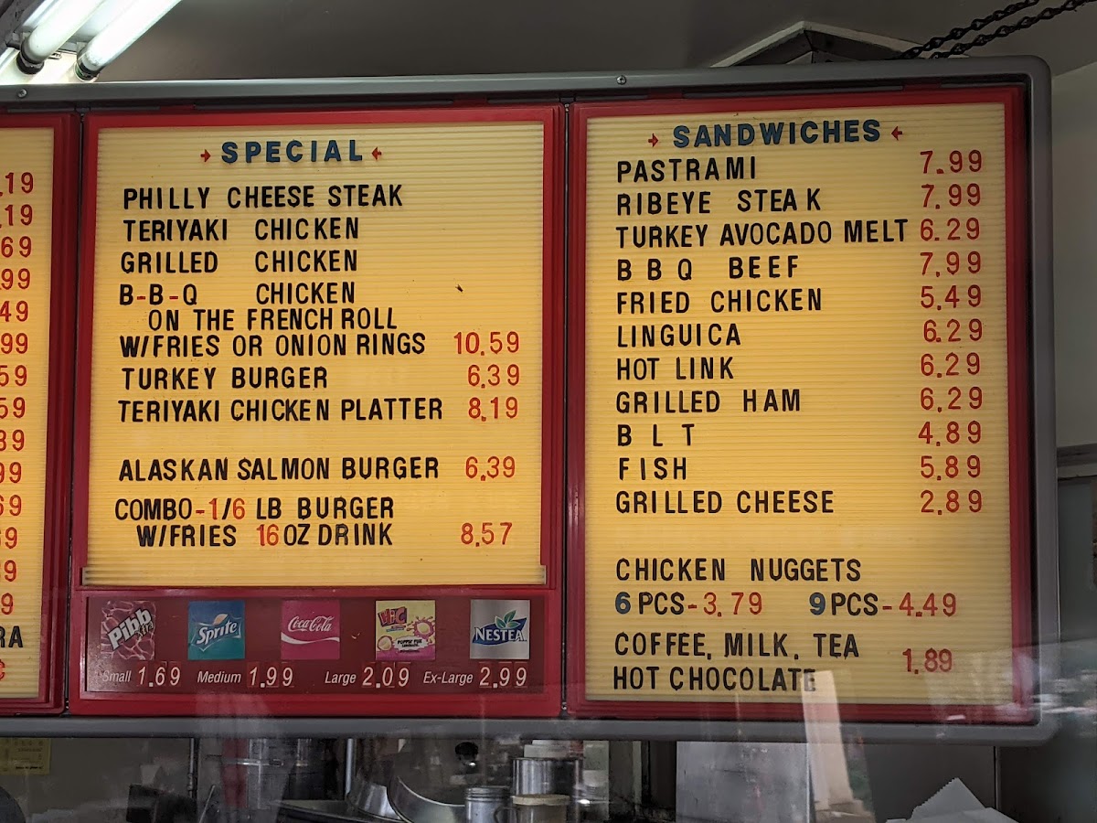 This menu is suitable for quick ordering or casual dining, with options that cater to customers looking for sandwiches, burgers, fries, and classic takeout dinners. The selection supports a range of preferences, from lighter meals to more filling platters.